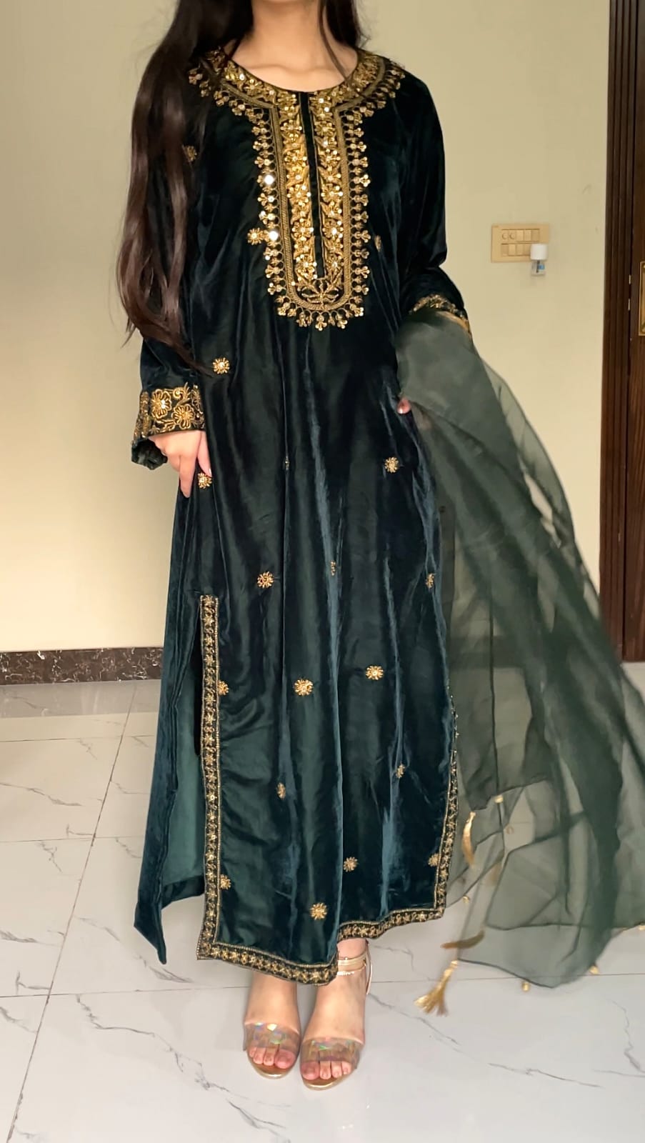 Fabric: Luxurious Micro 9k Velvet Kaftan ,Trouser in Kattan silk and Sheer Organza (Dupatta)