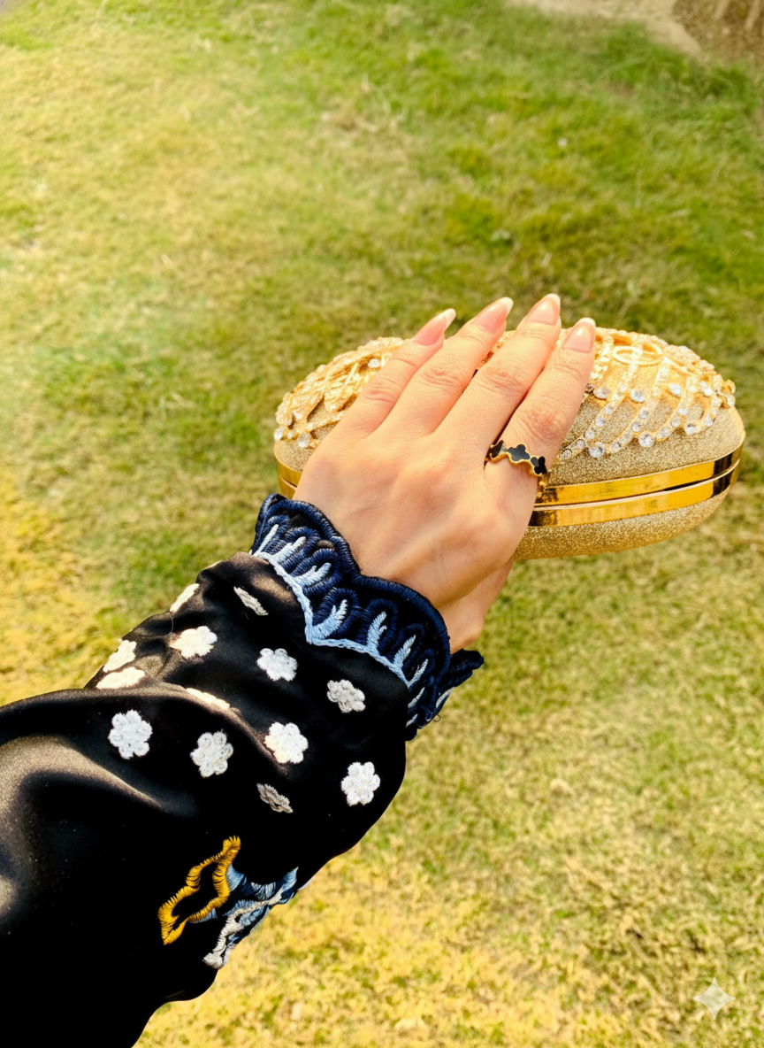 Kaftan (Full-Length): Crafted from soft and flowing shamose silk. Features elegant embroidery detailing on the neckline, daman (hem), and sleeves for a sophisticated look.